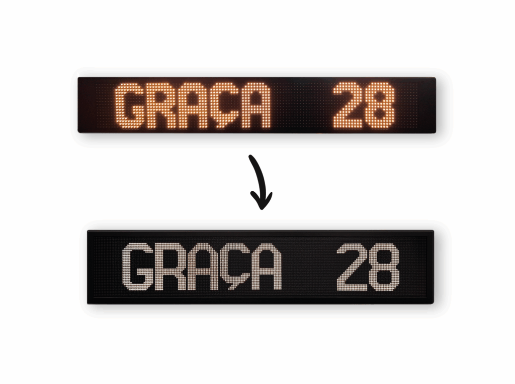 Com alta resolução e tecnologia de ponta, os novos indicadores de destino proporcionam uma experiência visual mais nítida, moderna e eficiente. Graças ao ajuste automático de luminosidade e ao amplo ângulo de visão, garantem excelente visibilidade em qualquer ambiente, independentemente das condições de iluminação. Além disso, o elevado nível de resolução, com pitch de 7.62 mm, assegura uma leitura rápida, precisa e confortável, mesmo a longas distâncias.